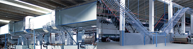 公司新研制開發(fā)的通過式低溫皮革干燥系統(tǒng)包含皮革懸掛鏈系統(tǒng),皮革干燥通道和干燥調(diào)溫空調(diào)機(jī)組。低溫皮革干燥系統(tǒng)將皮革干燥通道分為若干個區(qū)域進(jìn)行溫度和濕度的獨(dú)立控制,為皮革提供了一個均勻的、穩(wěn)定的、漸進(jìn)的干燥環(huán)境。低溫皮革干燥系統(tǒng)可限度地減少皮革干燥過程中的收縮并較高干燥效率。